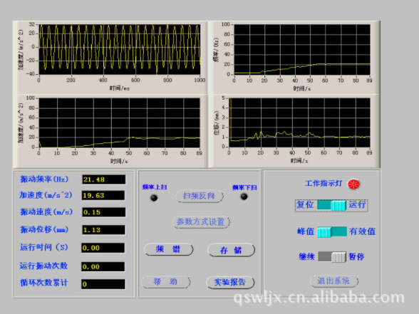2. 自動(dòng)搜索共振頻率,實(shí)時(shí)顯示搜索曲線、以畫面形式實(shí)時(shí)顯示動(dòng)態(tài)振動(dòng)波形、頻譜圖,振級(jí)曲線即頻率—時(shí)間,加速度—時(shí)間,位移—時(shí)間曲線,以數(shù)值形式顯示頻率、加速度、速度、位移等。